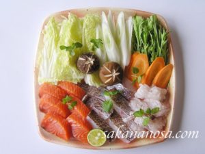 サバフグ、冷凍生ズワイガニ、ホタテ貝柱、餅、野菜はお好みで 少し濃いめの味噌味鍋がおすすめです。