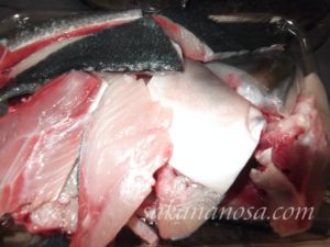 どうしても最後骨が硬くて包丁が通らないという場合は包丁が途中まで入ったブリの頭を頭ごと持ち上げて落として割るというやり方もあります。※このやり方わかる人わかりますね。